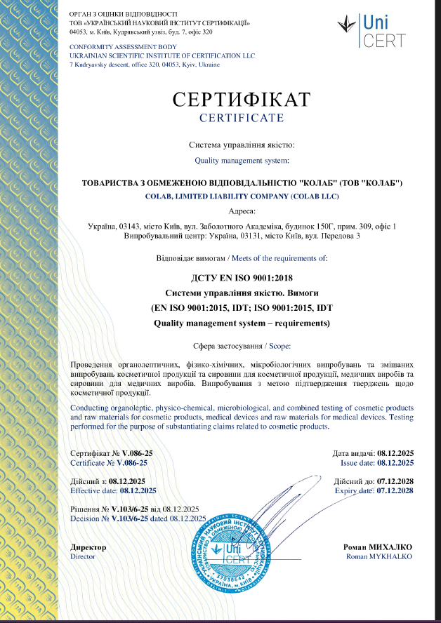 Колаб — це сучасна випробувальна лабораторія в Києві, що спеціалізується на тестуванні косметичної продукції та сировини, медичних виробів, а також косметичних засобів для тварин.